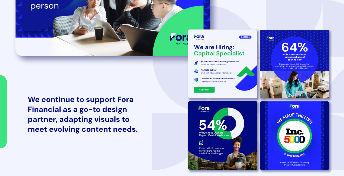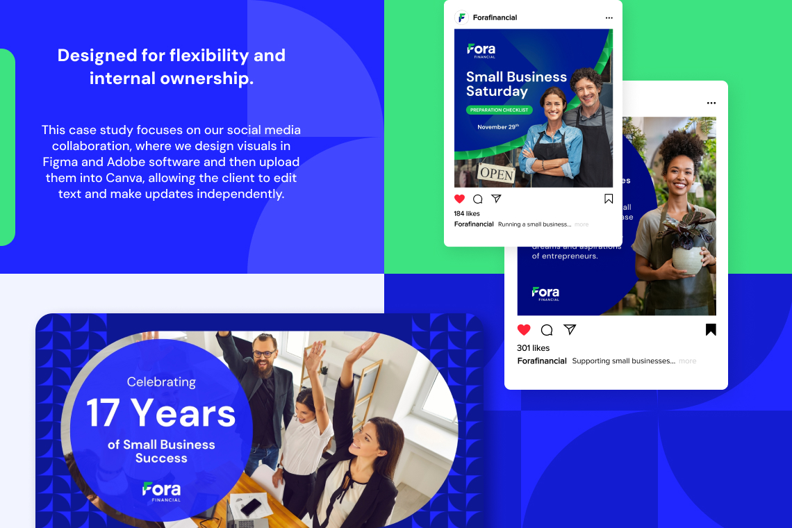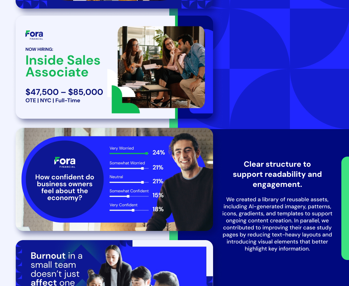 We partnered with Fora to develop a cohesive visual system for their digital communication, covering social content, recruitment assets, and ongoing campaigns. The goal was to translate complex information into clean, engaging layouts while maintaining brand consistency across every touchpoint. Our work delivered flexible templates, clear hierarchy, and a modern visual language that strengthens Fora’s online presence. We continue supporting the team with adaptable creative as the brand grows.