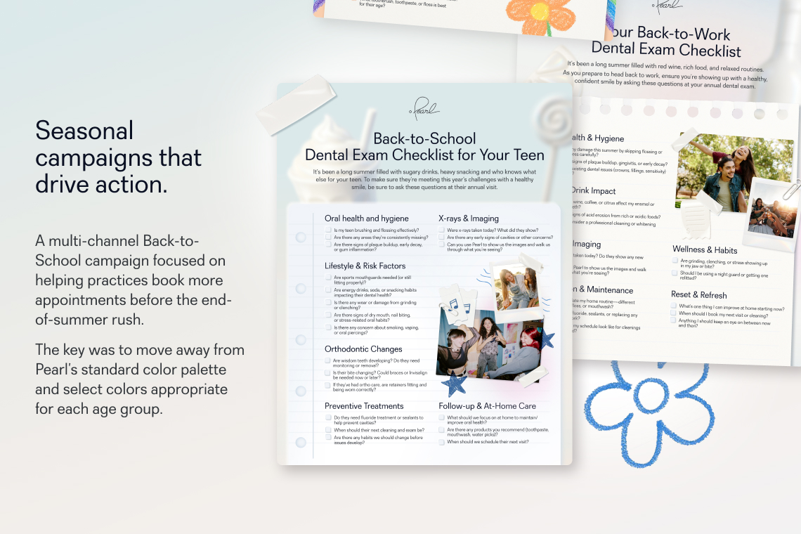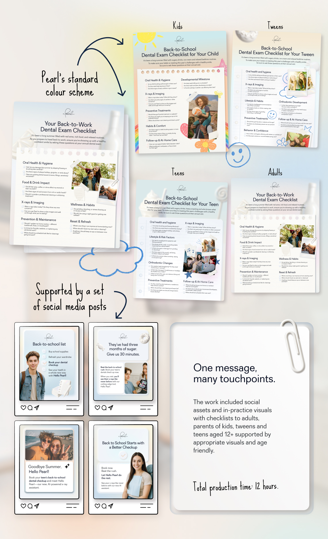 We developed a seasonal Back-to-School campaign for Pearl, a U.S.-based healthcare brand, designed to drive appointments during the end-of-summer rush. The project included a series of dental exam checklists tailored to different age groups — kids, tweens, teens, and adults — each adapted with age-appropriate colors, visuals, and messaging. To ensure consistent communication across channels, the campaign was supported by a coordinated set of social media assets. The result was a clear, friendly, multi-touchpoint system that made preventive care easy to understand and act on, while staying true to Pearl’s brand identity.