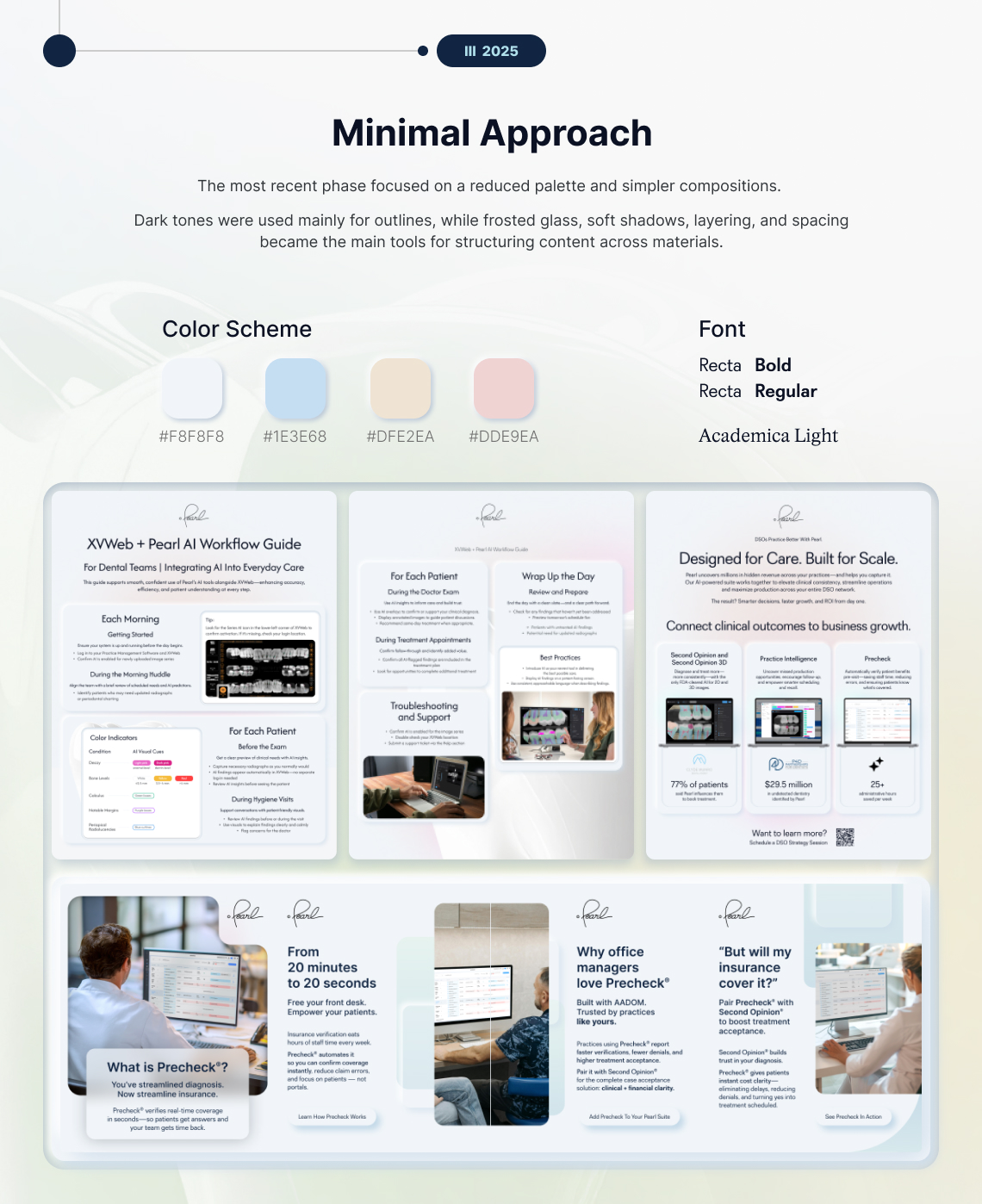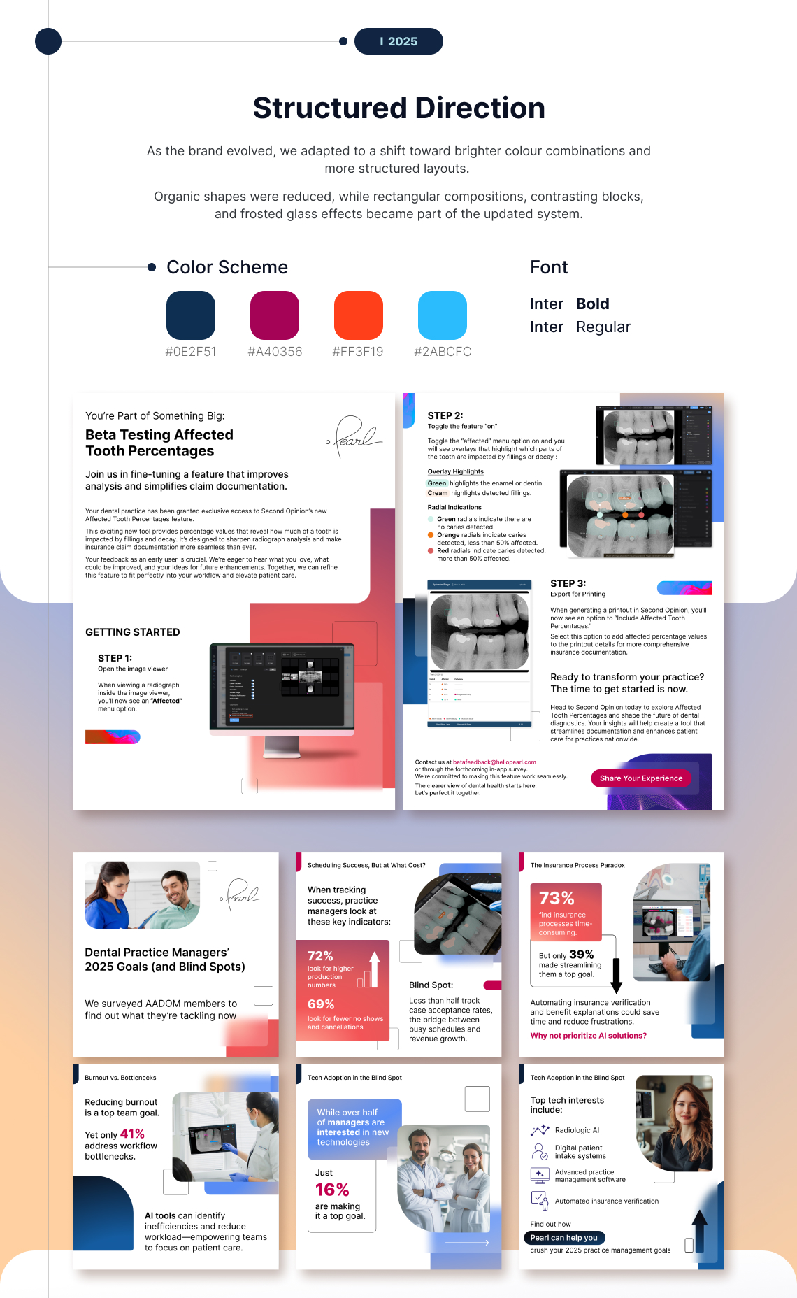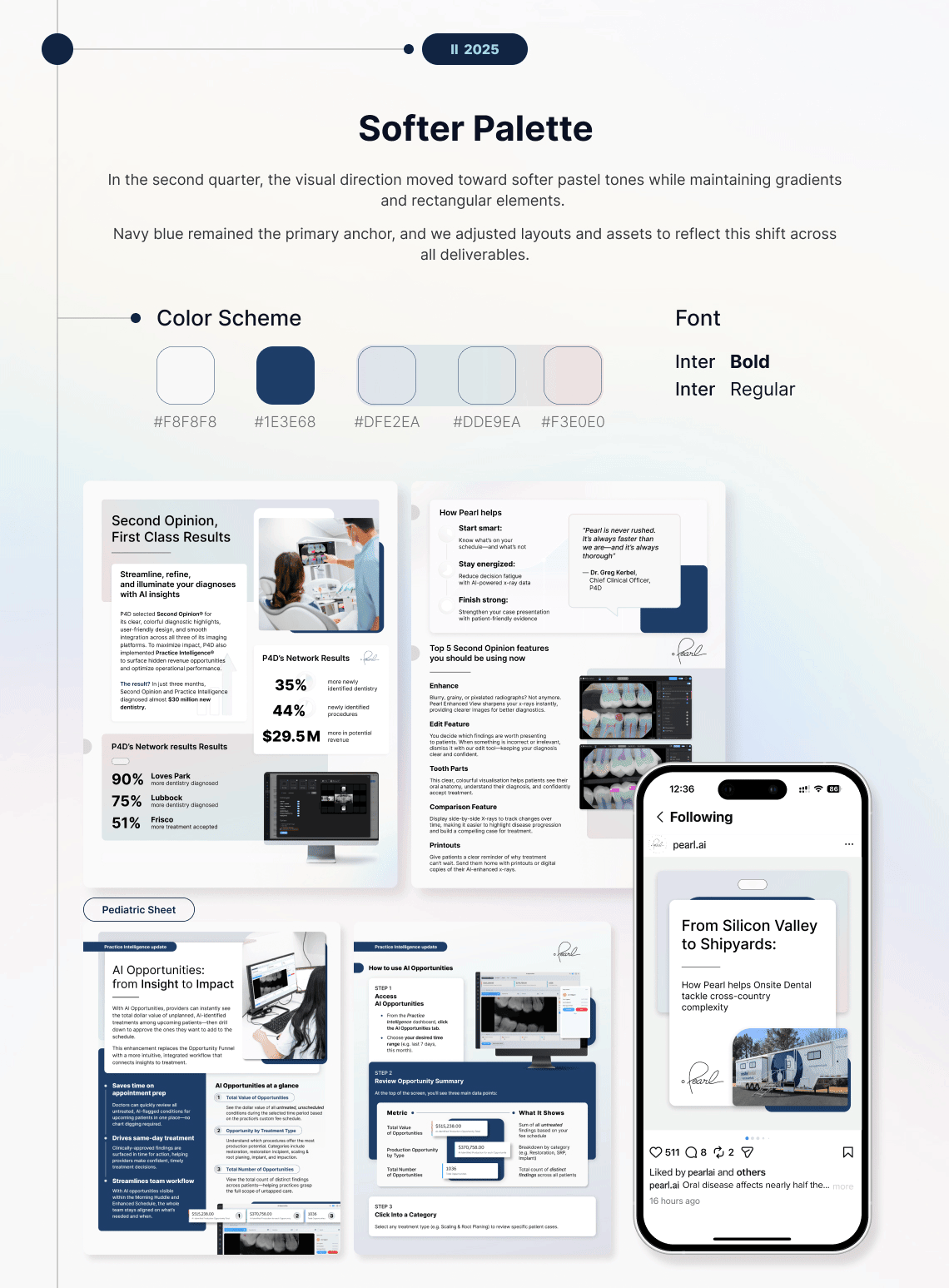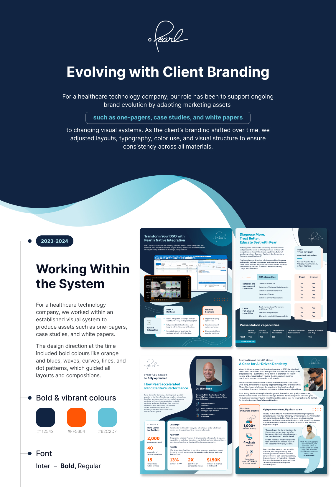 Developed an evolving visual system for a healthcare technology client, adapting marketing assets as the brand matured. The work included one-pagers, case studies, white papers, and social media visuals, all updated to maintain consistency across changing brand directions. Over time, the design shifted from bold, vibrant colors to softer palettes and a more minimal approach. Layouts, typography, and visual structure were refined to improve readability while preserving brand recognition across all materials.